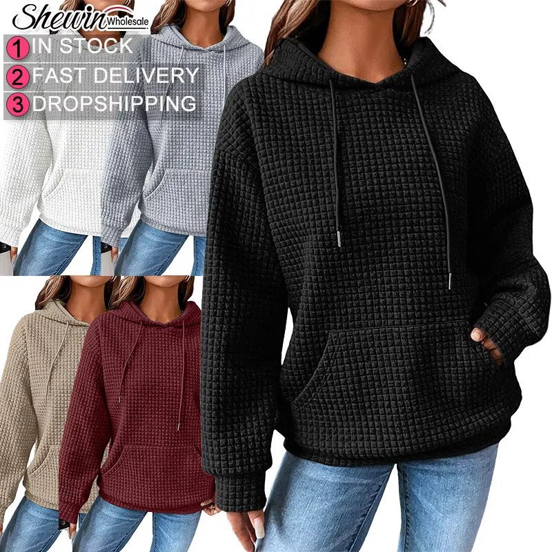 Shewin 2026 Women's Oversized Vintage Pullover Sweatshirts High Quality Plain Knit Hoodies Lined Collar Casual Print for Autumn